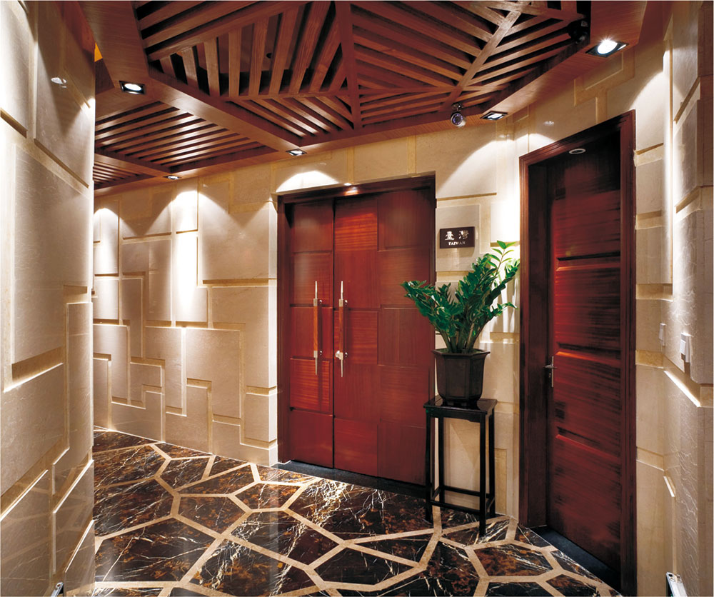 設(shè)計說明:設(shè)計手法上運用豐富的材料,以深色石材,自然木材,混凝土飾面,磚的立體形態(tài)等等,結(jié)合東方元素圖案進行設(shè)計,各種材料的質(zhì)感在照明設(shè)計的引導(dǎo)下發(fā)揮出最優(yōu)效果,裝飾燈具的搭配令空間更加豐富、更加引人注目,給人明亮開揚的視覺感受。
